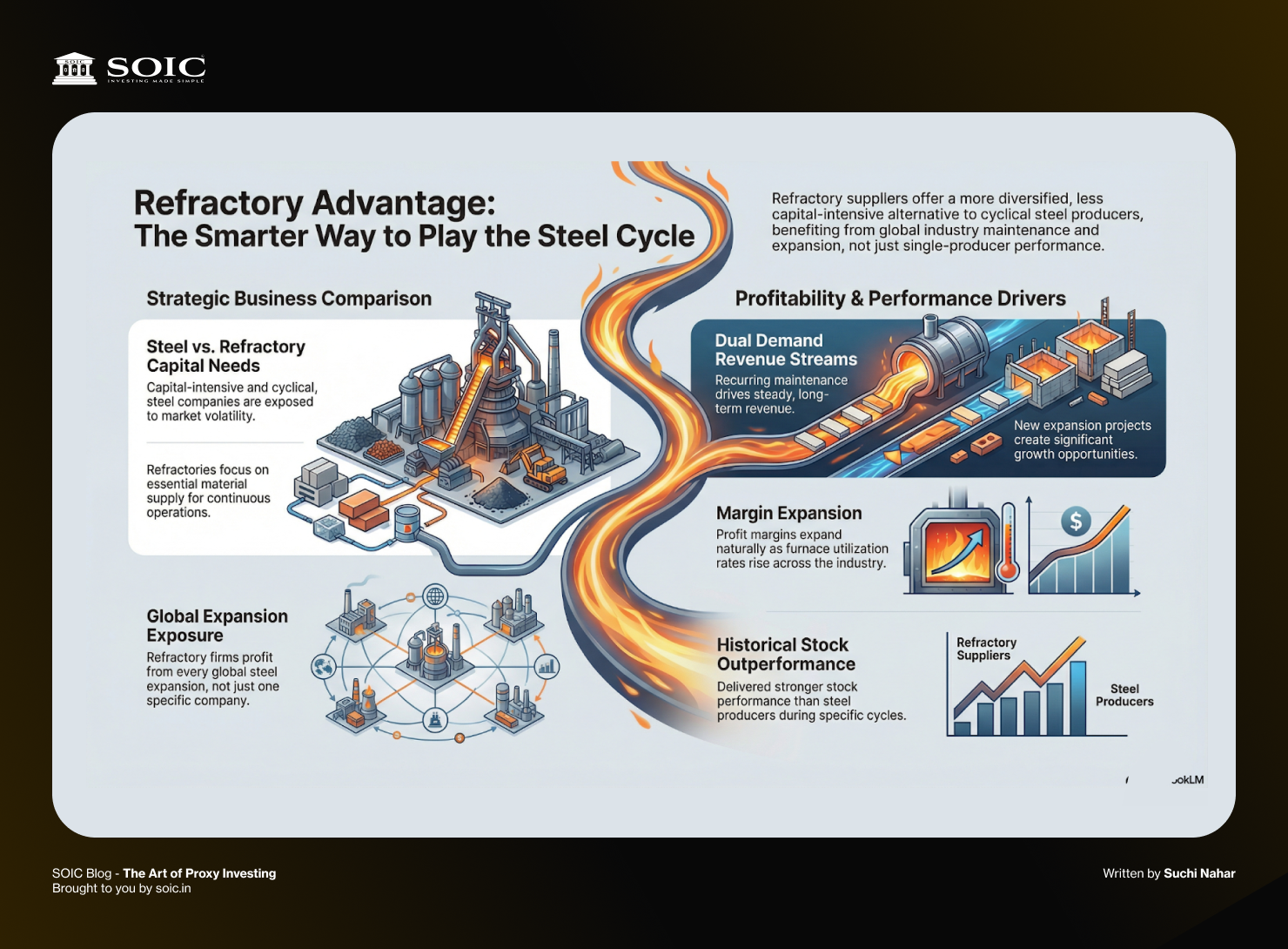 As shown in the SOIC research examples, suppliers such as refractory producers or component manufacturers sometimes outperform core industry players over long periods because they benefit from multiple customers simultaneously.