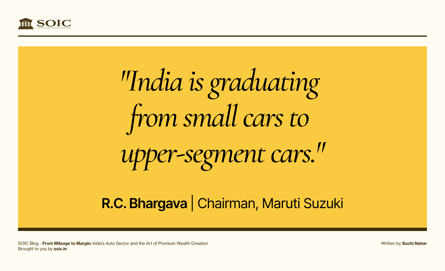 “India is graduating from small cars to upper-segment cars.” – R.C. Bhargava, Chairman, Maruti Suzuki