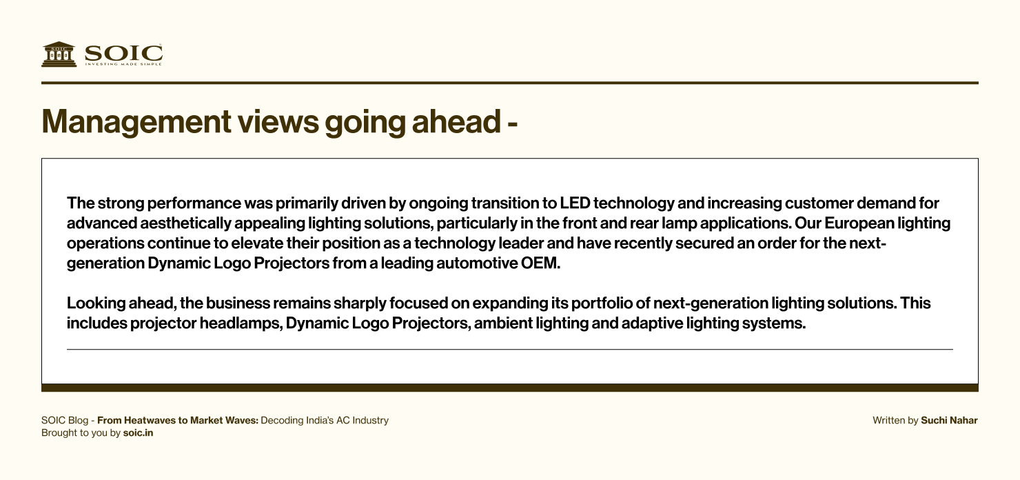 Uno Minda’s lighting systems, digital clusters, and connected cockpits are scaling rapidly.