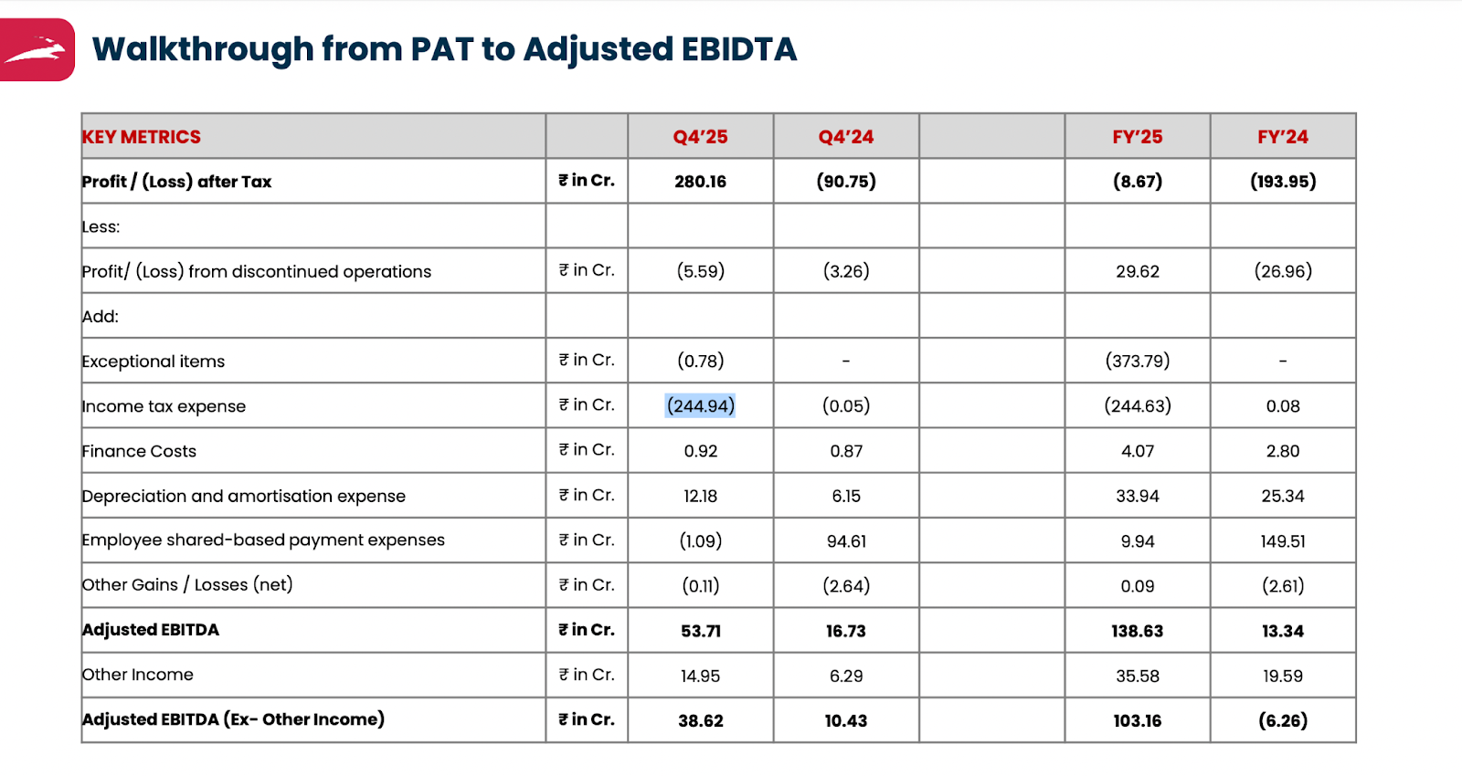 In Q4FY25 results, there was a one off in the results of Blackbuck. There was an income tax Write back of 245 crores, and adjusted for that the PAT of the company would have been close to 30-32 crores.